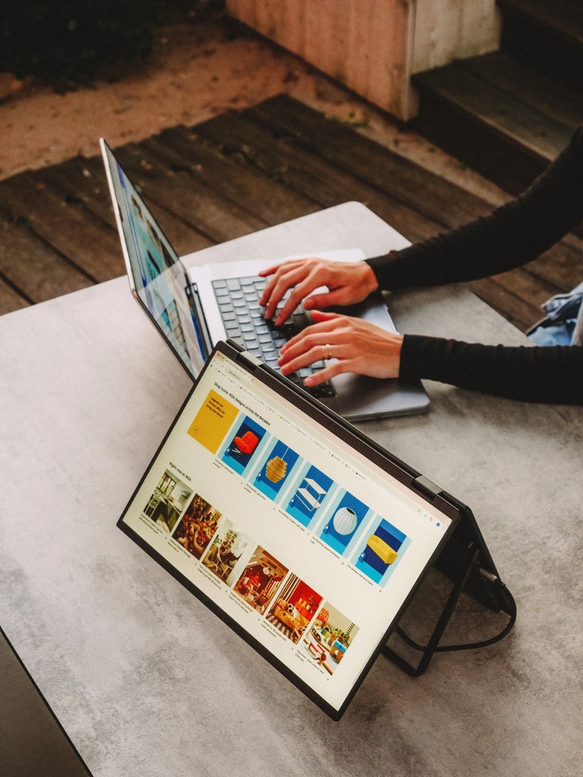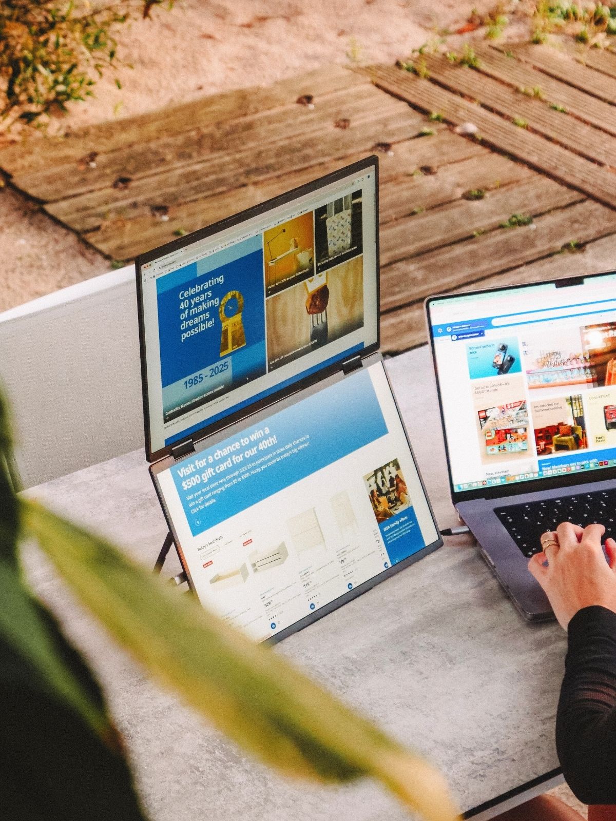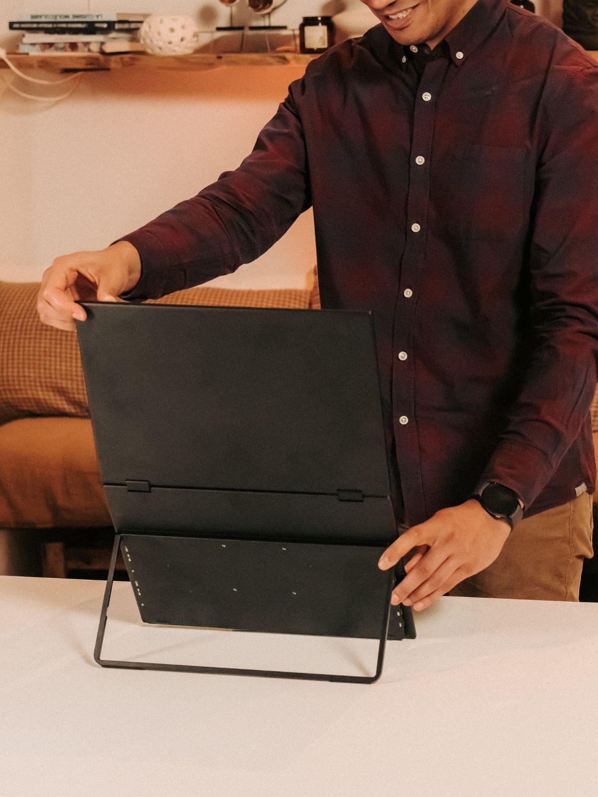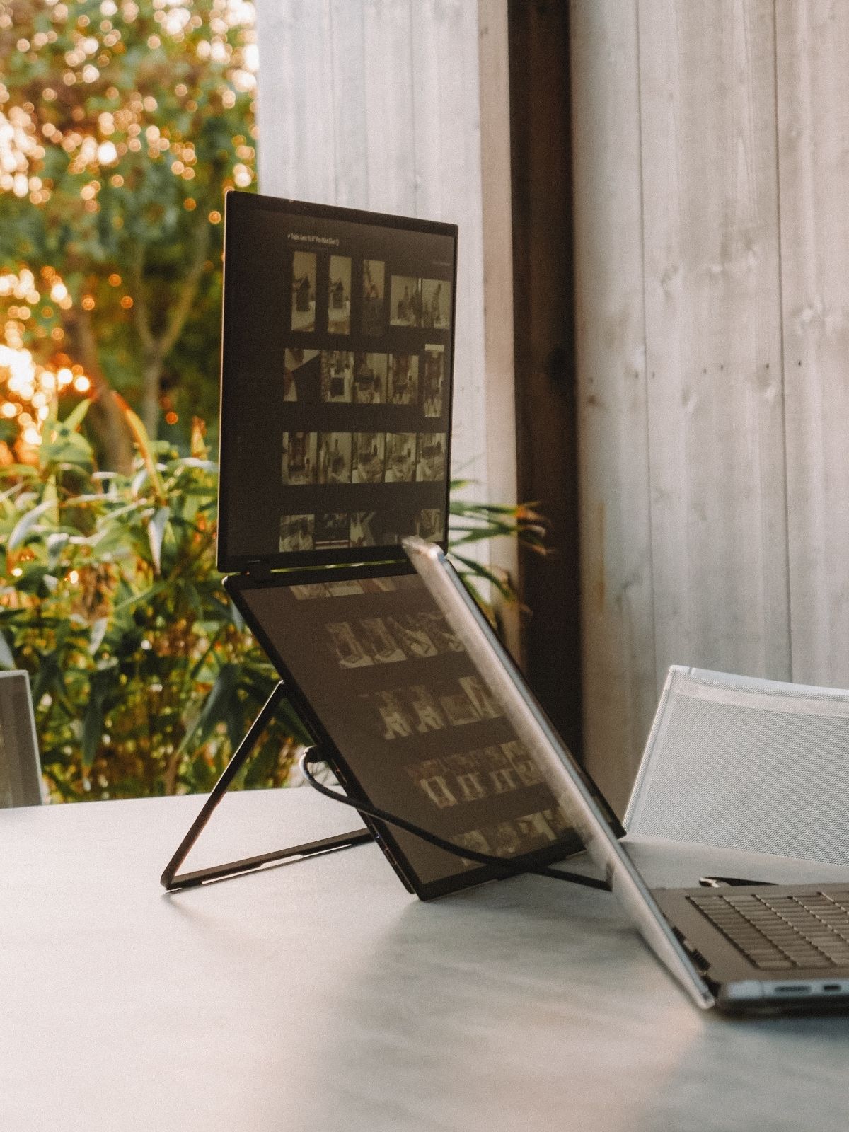 Load video: <ol><li>Unfold the stand</li><li>Open the screens</li><li>Connect it to your laptop via USB-C</li><li>You’re ready to work, play, and unwind.</li></ol>