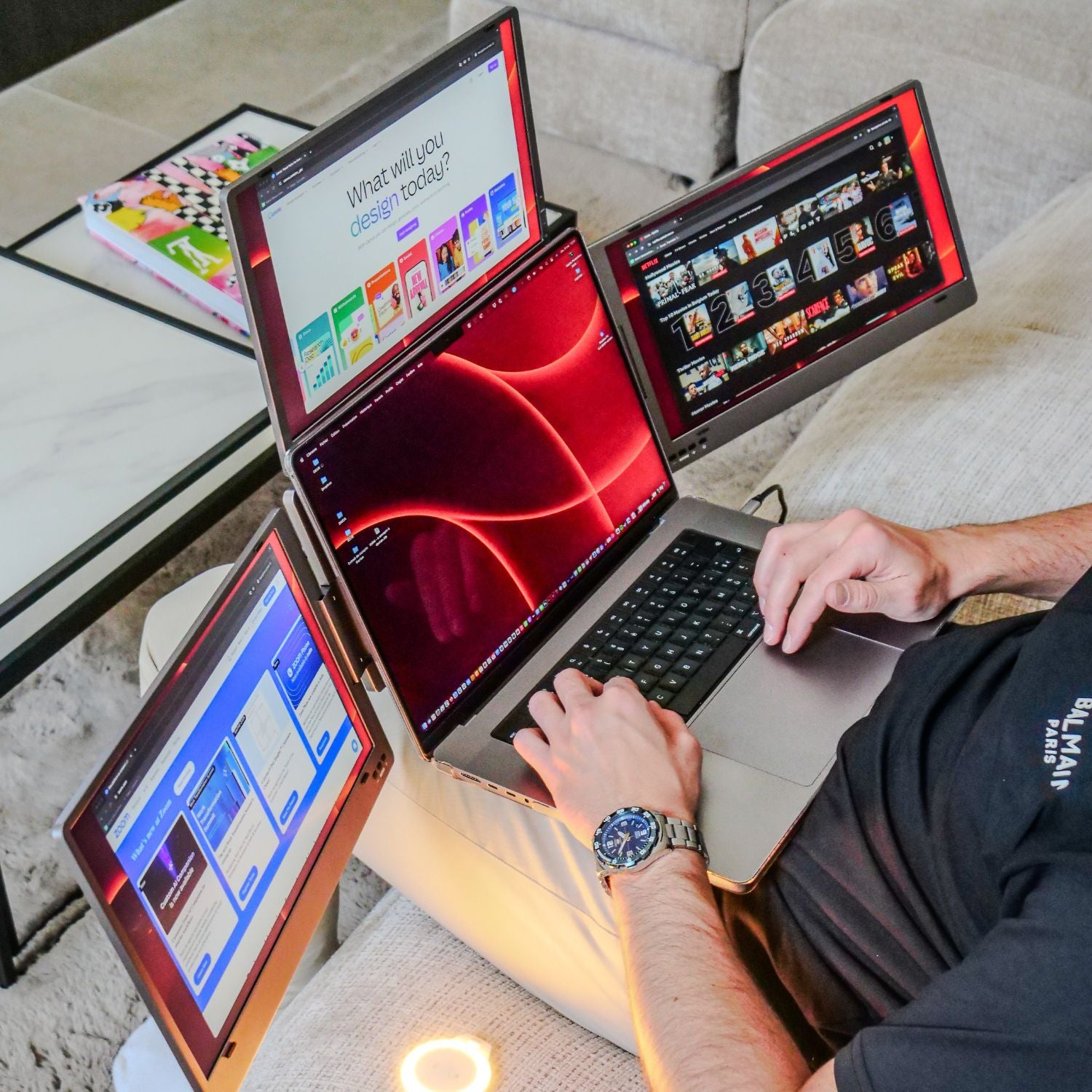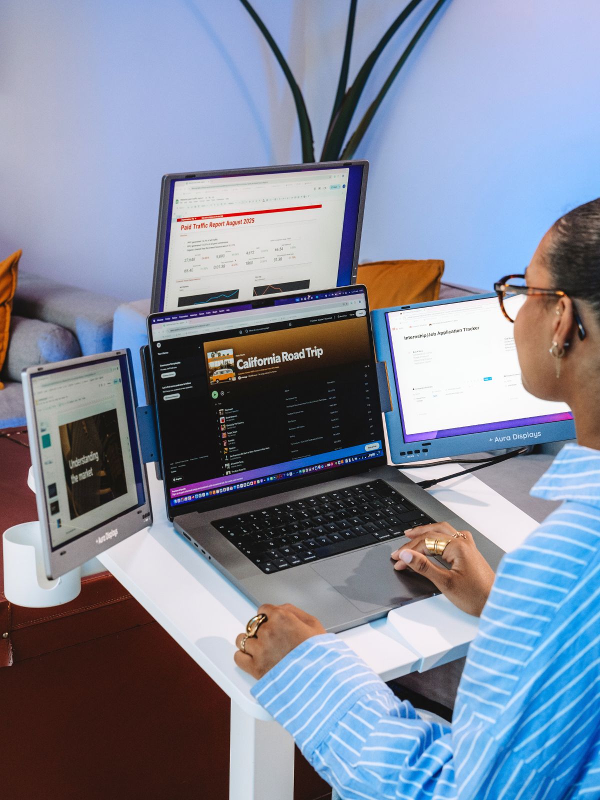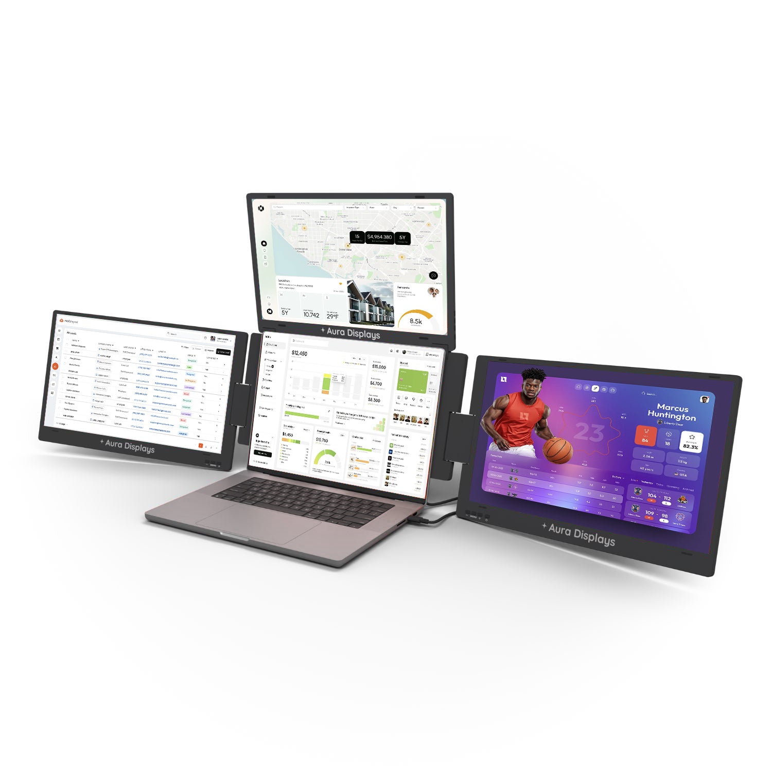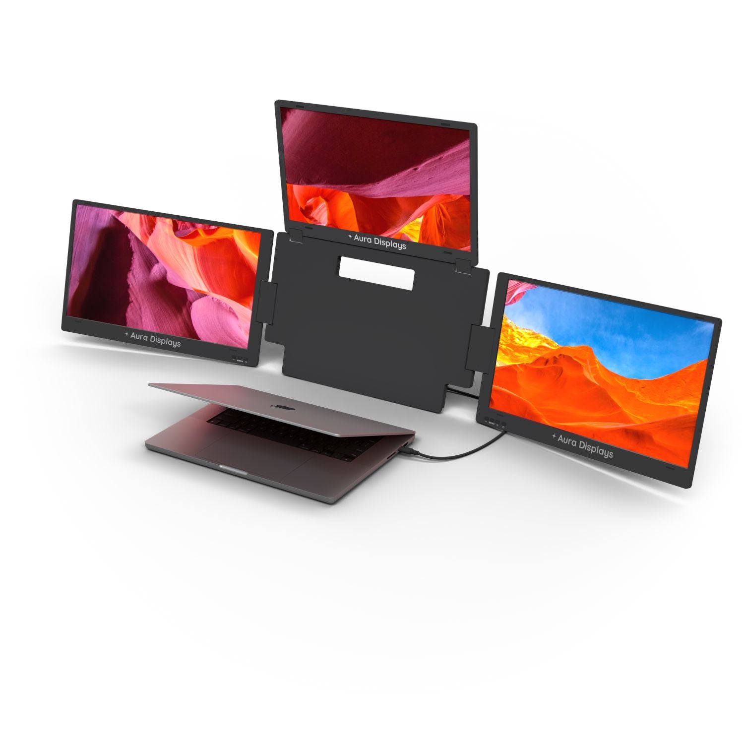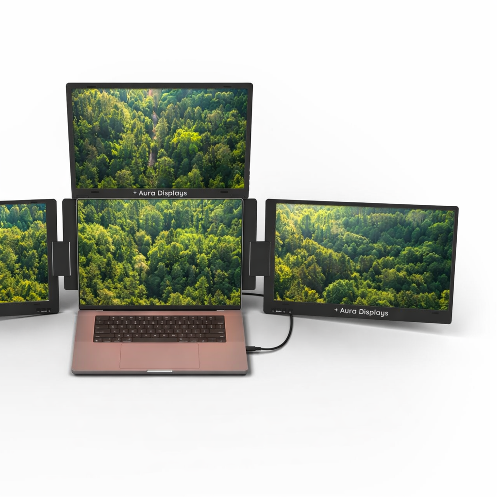 Introducing the Triple Boost Pro, the pinnacle of mobile productivity and the highest-quality triple screen extender ever built. Precision-engineered entirely from premium aluminum, it delivers a robust, immersive, professional feel. Featuring three stunning anti-glare monitors, the entire system connects seamlessly through a single, powerful USB-C connection. It is the essential, portable command center for elite performance, anywhere you work.