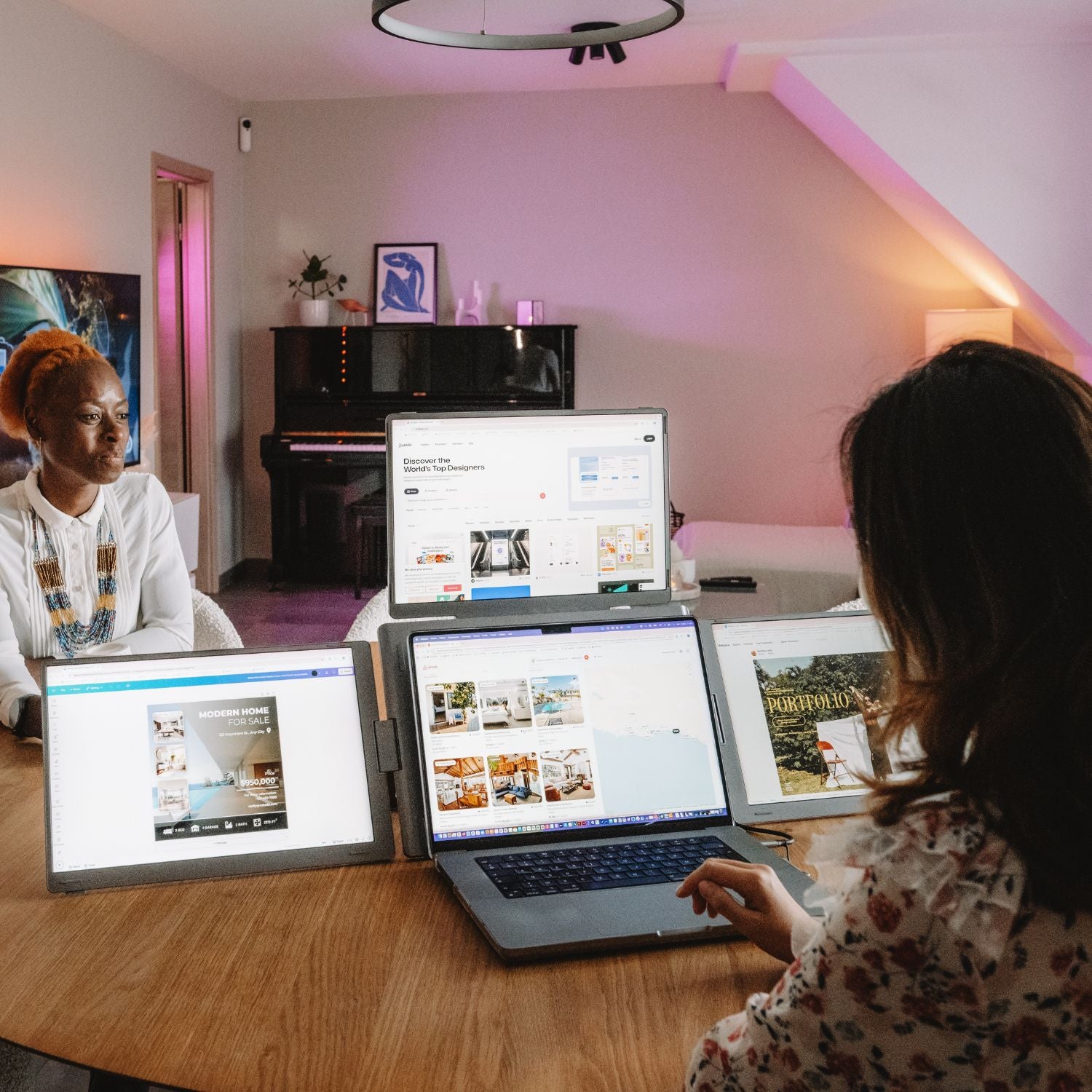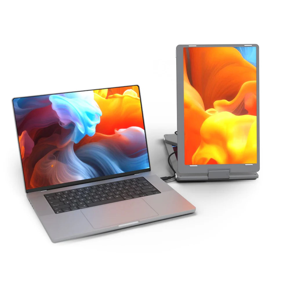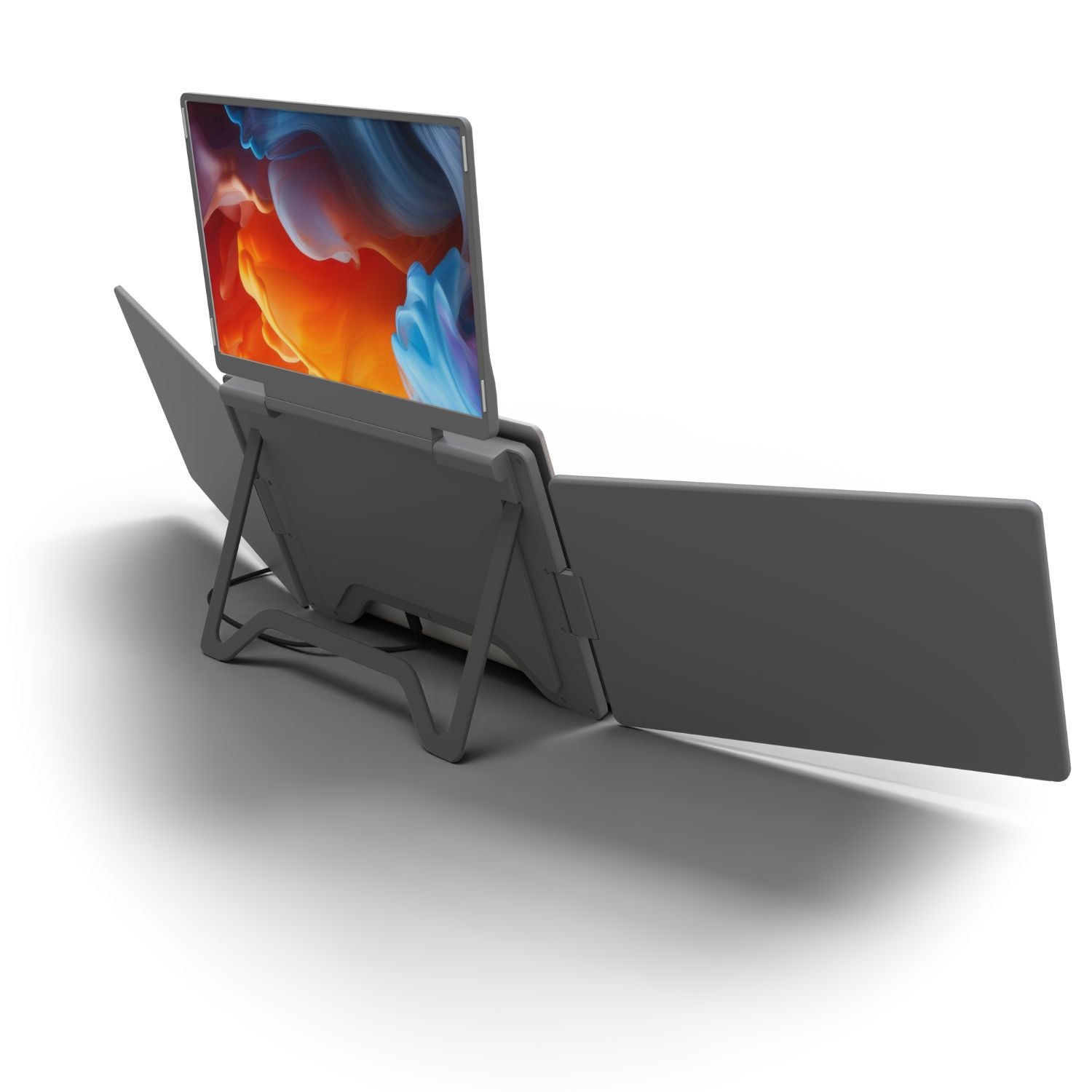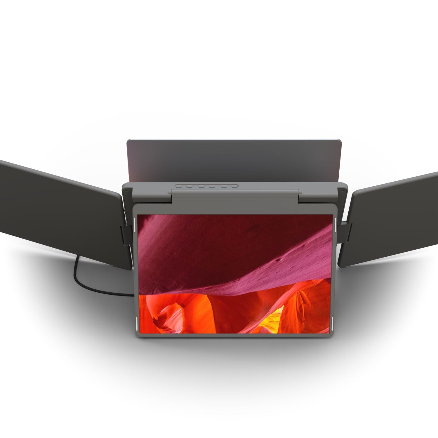 Introducing the Triple Go, the ultimate productivity booster designed to deliver an immersive, cockpit-style experience. This device achieves the perfect balance between maximum screen real estate and lightweight portability. Crafted from durable composite materials with premium aluminum accents, the Triple Go is built for discerning professionals on the move. Power is intelligently managed: the left and right displays connect via a single USB-C cable, while the top monitor utilizes the included power supply to ensure stable, maximum performance across all three anti-glare screens